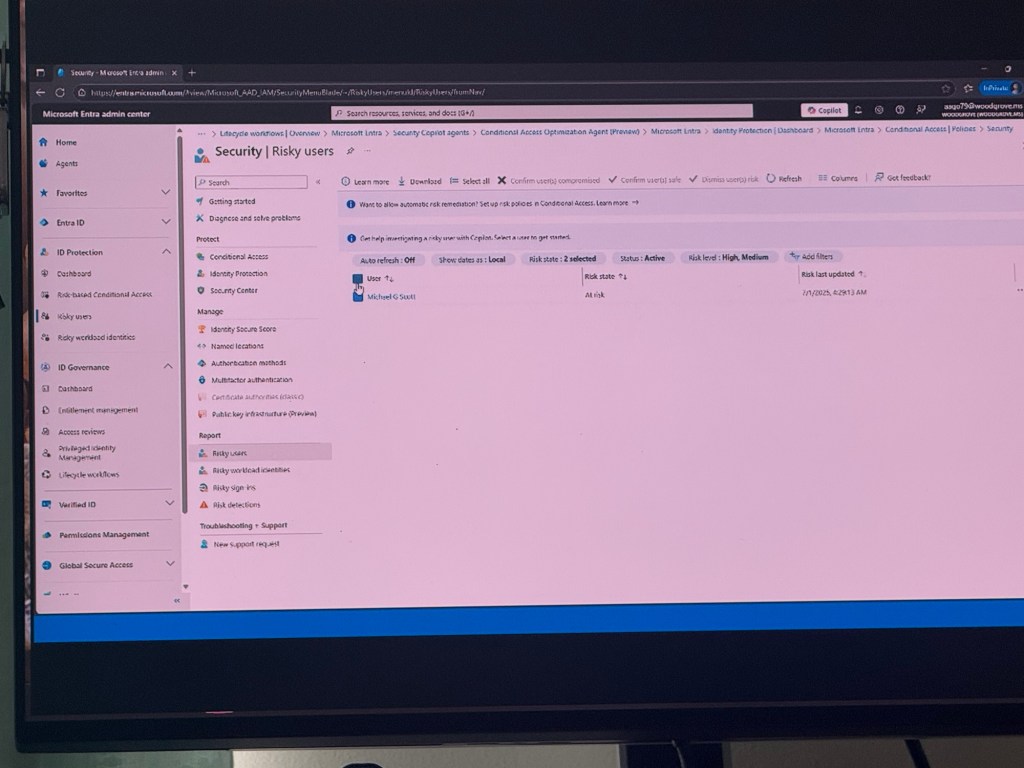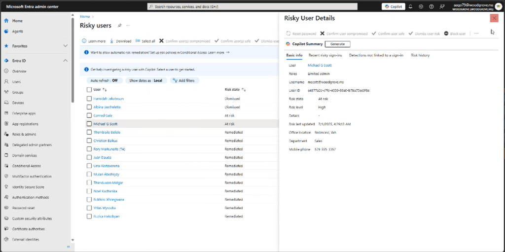 The dashboard provides a comprehensive view of security settings, including risky users and conditional access policies.