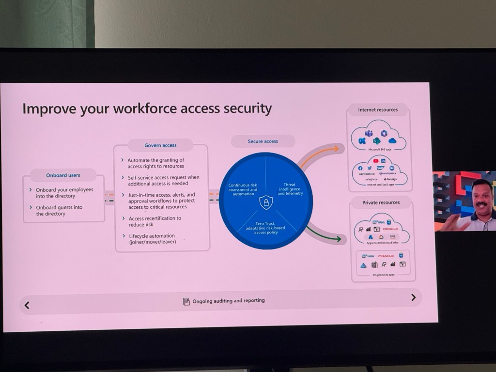 “Secure access” and includes “Onboard users,” which involves adding both employees and guests to a directory. “Govern access” features automated access rights granting, self-service access requests for additional needs, and just-in-time access with alerts and approval workflows to safeguard critical resources. It also mentions access recertification to minimise risk and lifecycle automation for managing user transitions (joiner/mover/leaver). There should be continuous risk assessment and automation, threat intelligence, and telemetry. The Zero Trust model with an adaptive risk-based access policy.