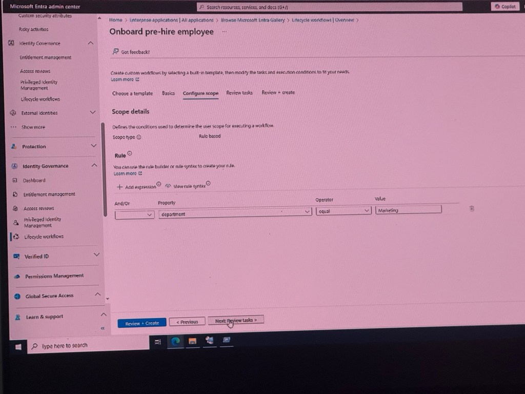 The Microsoft Entra admin centre offers a range of features for managing identity and access. It includes custom security attributes, identity connection, entitlement management, and privileged identity management. The centre also supports lifecycle workien, external identity protection, identity governance, and a dashboard for monitoring. It provides permissions management, global secure access, and resources for learning and support. Users can onboard pre-hire employees by selecting a template and modifying tasks and execution conditions to fit their needs. The centre allows for defining user scope conditions, creating rules using rule-based syntax, and applying access restrictions based on properties like department.