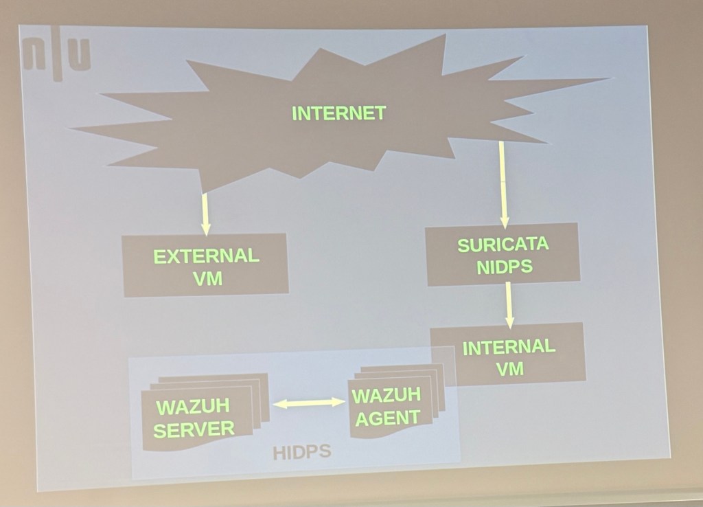 diagram shows a layered intrusion detection setup. Internet traffic flows to an external VM and through Suricata NIDPS before reaching an internal VM, which is monitored by Wazuh agents. The Wazuh server collects and analyses alerts from the agents, forming a Host-based Intrusion Detection and Prevention System (HIDPS). Suricata is like CarbonBlack and Paloalto