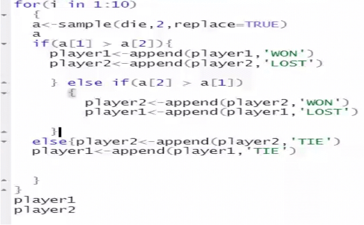 Coin tossing game: Let the two players toss the coin, the one who get head value will win the game. Repeat it 10 times, find the statistics.