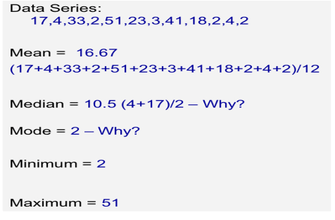 We can describe the series we looked at in the previous example as: “Minimum of 2, Maximum of 51, Average of 16.6.”