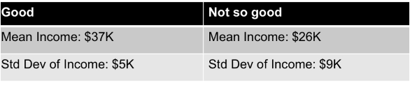 Variation in income is higher in Not so good, implying there is an overlap in income in Good and Not so good.