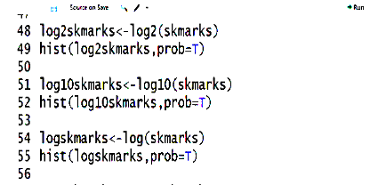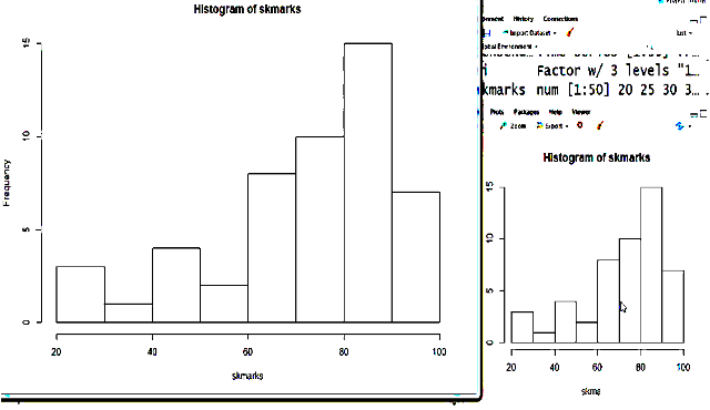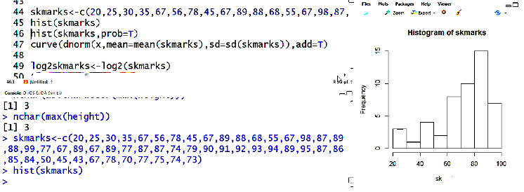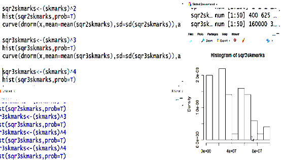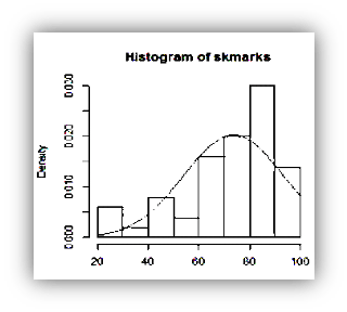 curve(dnorm(x,mean=mean(skmarks),sd=sd(skmarks)),add=T) adds the curve to the graph.